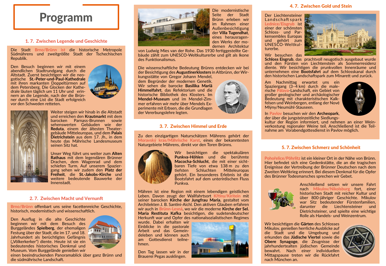Program: zastávky v Brně, v Moravském krasu s Punkevními jeskyněmi a propastí Macocha, dále poutní kostel v Křtinách, nově postavený kostel v Brně-Lesné, lichtenštejnský krajinářský park Lednice, procházka krajinou Pálavy, návštěva Archeoparku Pavlov, památníku v Pohořelicích a také města Mikulov.