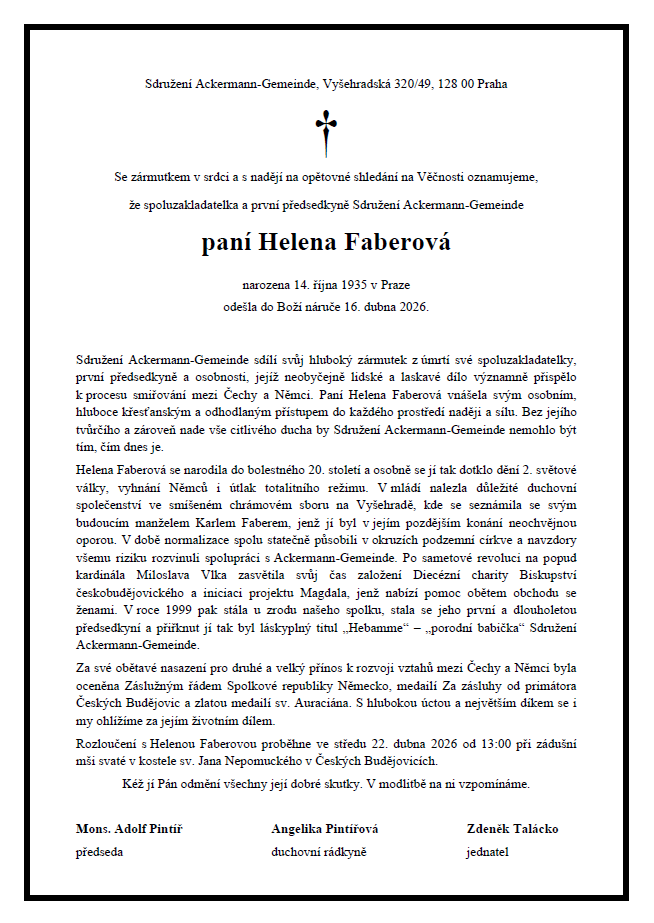 Drazí příznivci díla Sdružení Ackermann-Gemeinde, s hlubokou lítostí vám oznamujeme, že nás včera zasáhla zpráva o úmrtí zakladatelky a dlouholeté čestné předsedkyně našeho spolku Heleny Faberové. S díky a obdivem vzpomínáme na všechno dobro, které do našeho světa vnesla. Kéž jí Pán všechny její skutky oplatí.