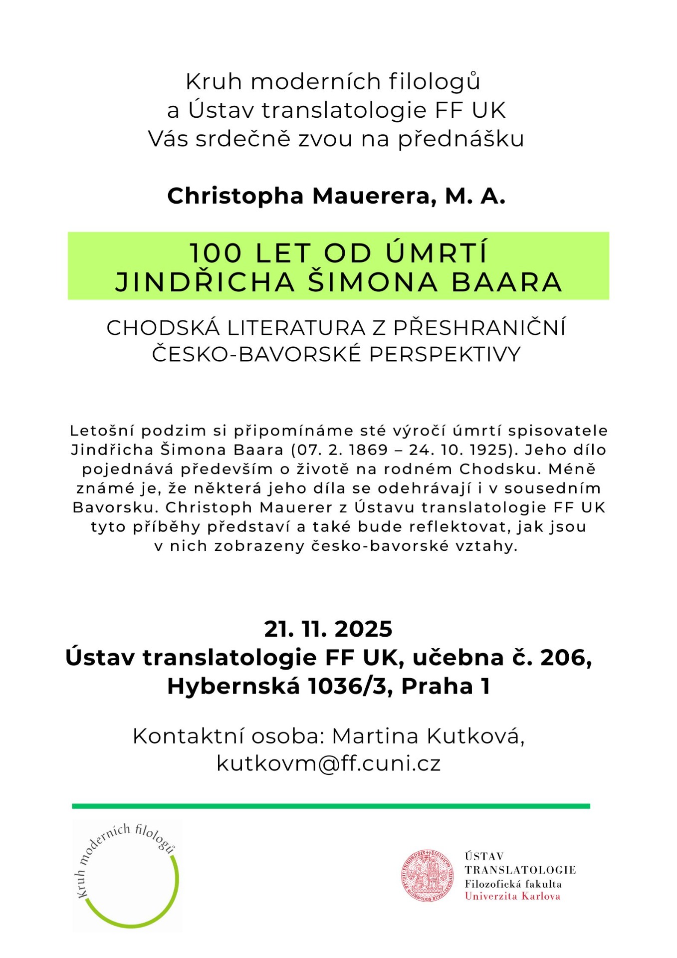 In diesem Herbst gedenken wir des hundertsten Todestages des Schriftstellers Jindřich Šimon Baar. Sein Werk behandelt vor allem das Leben in seiner Heimatregion Chodsko; weniger bekannt ist, dass einige seiner Werke auch im benachbarten Bayern spielen. Christoph Mauerer vom Institut für Translatologie wird diese Geschichten vorstellen und darauf eingehen, wie die tschechisch-bayerischen Beziehungen darin dargestellt werden.